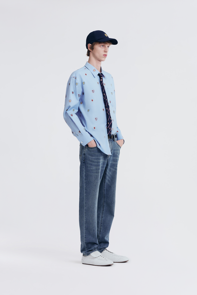 - Intricate all-over embroidery featuring colorful heraldic crests, including Kent&Curwen logo, lions and fleur-de-lis motifs