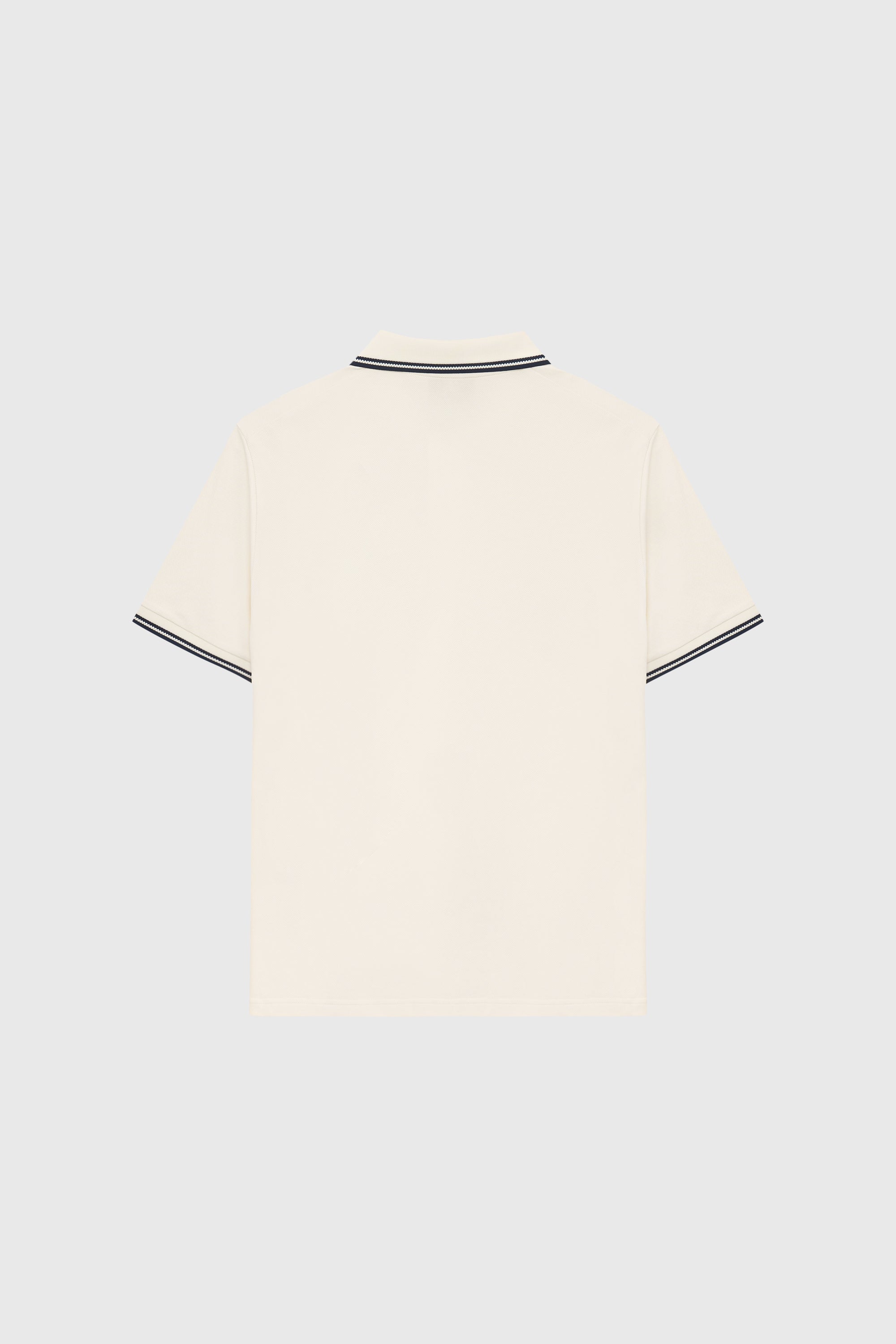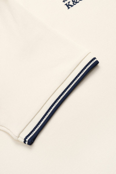 - Features contrasting navy-striped collar and sleeve cuffs